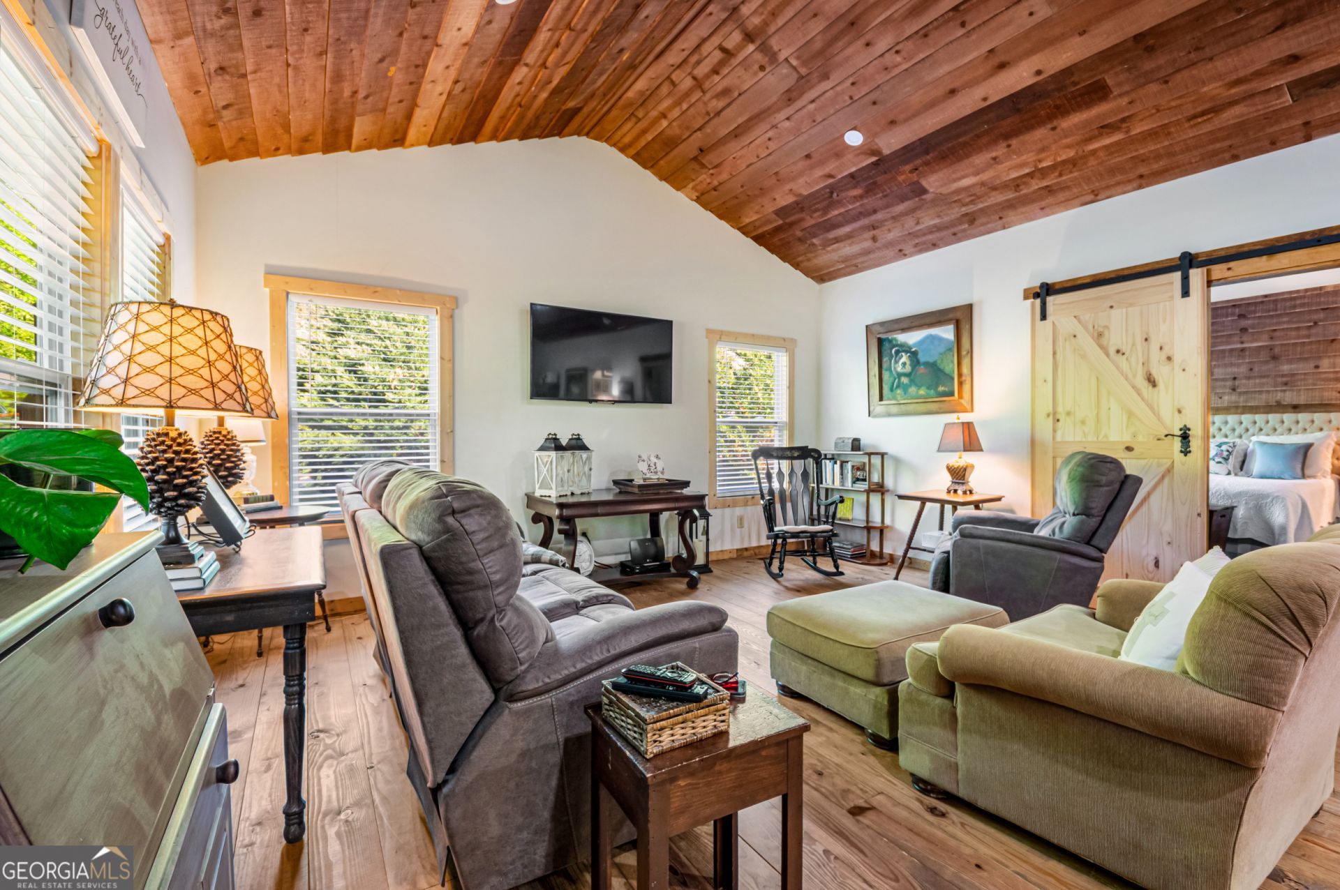 Tucked away in the North Georgia mountains, this charming 1-bedroom, 1.5-bath home in Rabun County offers the perfect blend of cozy living and natural beauty. Enjoy peaceful mornings on the wrap-around porch overlooking the creek that runs through the property, or take in seasonal mountain views right from your own yard. Inside, you'll find warm, rustic finishes including tongue-and-groove pine flooring and wood ceilings, complemented by a functional layout. The kitchen features a breakfast area with a granite island, perfect for casual dining or entertaining. The spacious tile shower adds a touch of comfort, while the hall laundry keeps things convenient. A small attic provides additional storage space. Outside, the beautifully landscaped yard enhances the serene setting, and a storage building/shop offers extra versatility for hobbies or equipment. Located just minutes from downtown Clayton and within walking distance to Black Rock Mountain, this property is ideal for a full-time residence, weekend getaway, or investment opportunity.